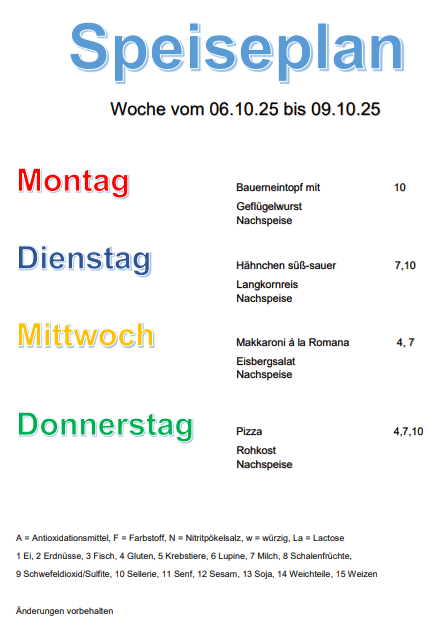 In der Mensa wird den Kindern im Zeitraum von 12.00 Uhr bis 12.30 Uhr und von 12:54 Uhr bis 13:30 Uhr ein Essen von der Firma Apetito zum Preis von 3,50 € serviert. Die Schülerinnen und Schüler können aber auch ihre eigene Verpflegung mitbringen.