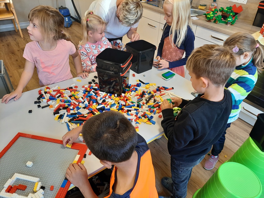 Zu Besuch war Frau Beine von der Pfarreigemeinschaft Obergrafschaft. Sie hat 150kg Legosteine mitgebracht, aus denen wir die Schöpfung nachgebaut haben.