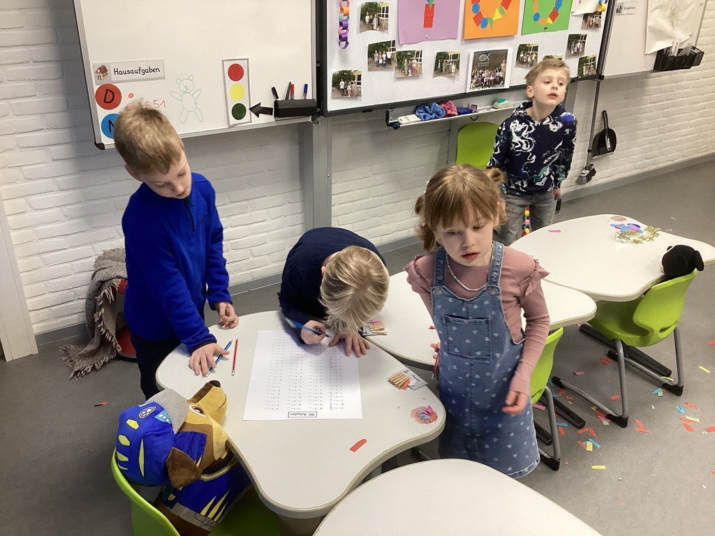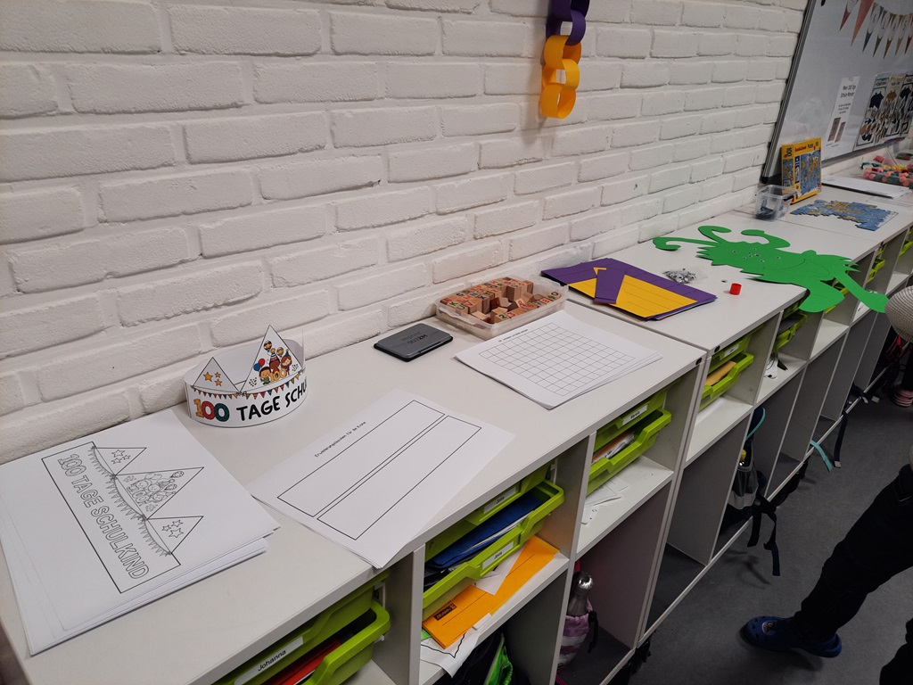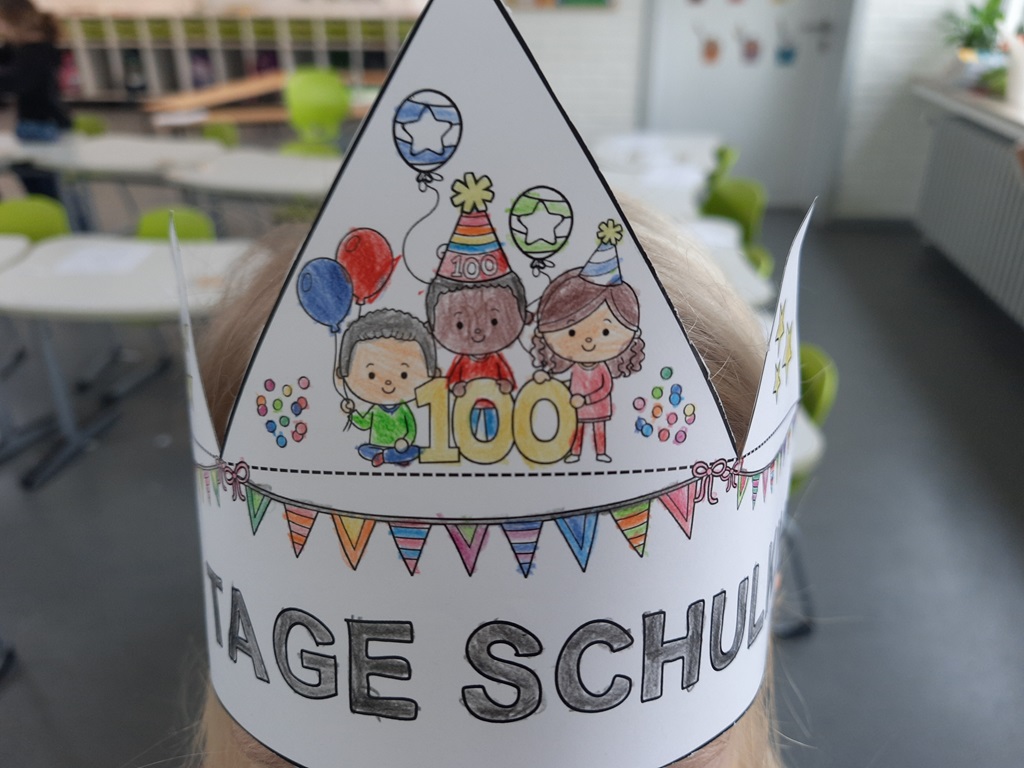 Grund genug, um Koala-Muffins zu naschen, Kronen zu basteln und Urkunden zu erhalten. Vor allem aber stand die Zahl 100 im Fokus. So wurden Girlanden aus 100 Papierschlaufen und Ketten aus 100 Büroklammern gebastelt sowie ein Monster mit genau 100 Augen verziert. Außerdem wurde 100 mal gestempelt, mit 100 Puzzleteilen gepuzzelt, es wurden 100 Matheaufgaben gerechnet und 100 Wörter geschrieben.