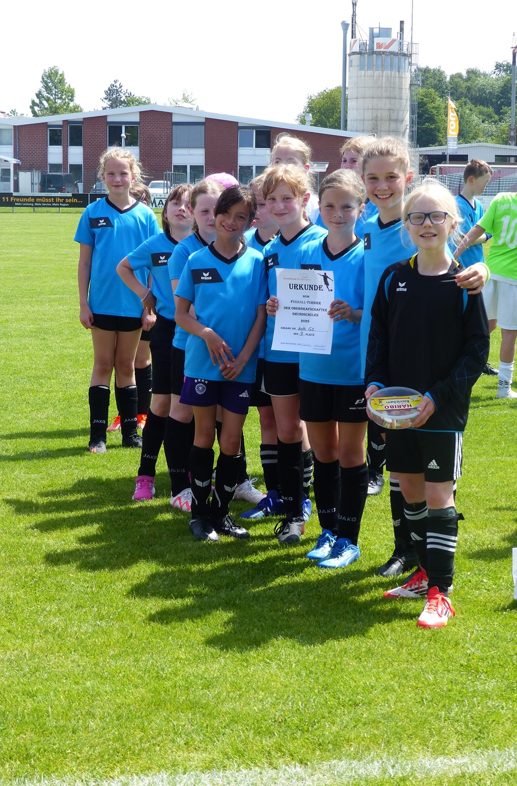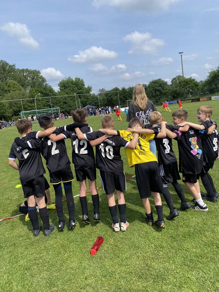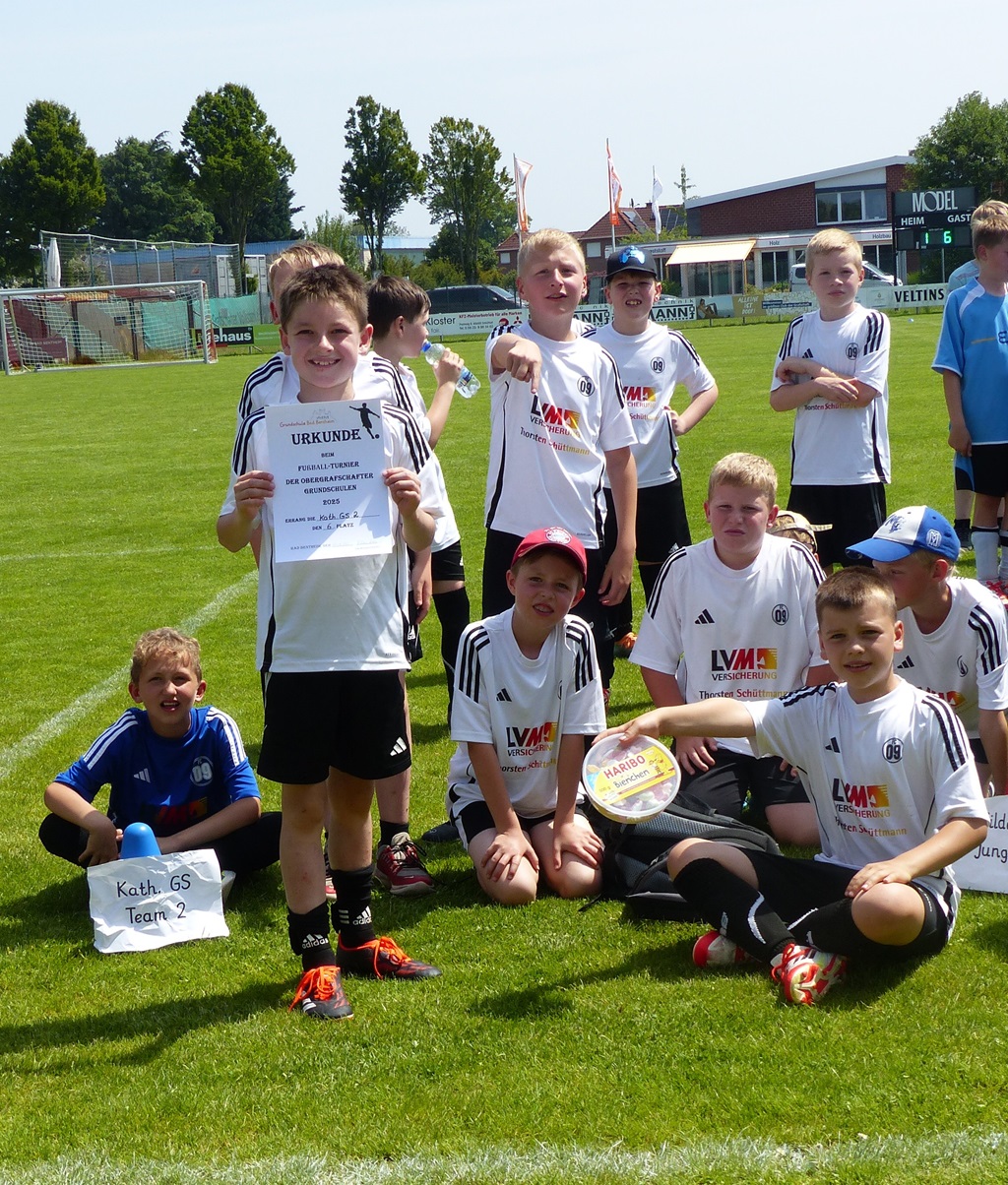 Am 13.06.25 nahm unsere katholische Grundschule mit zwei Jungen- und einer Mädchenmannschaft am Fußballturnier der Obergrafschafter Grundschulen teil. Alle vierten Klassen waren mit vor Ort, unterstützt von einigen Spielerinnen und Spielern aus den dritten Klassen – eine starke Schulvertretung! Die Mädchenmannschaft erreichte einen großartigen 3. Platz, erzielte 7 Tore und ließ nur ein Gegentor im Halbfinale zu. Auch die Jungenmannschaften zeigten vollen Einsatz: Team 1 belegte Platz 4, Team 2 Platz 6 von insgesamt zehn Teams. Bei hochsommerlichen Temperaturen sorgten Wassereimer zur Abkühlung für Spaß und Erfrischung. Besonders hervorzuheben war die großartige Stimmung: Mitschülerinnen und Mitschüler sowie die Teams selbst feuerten sich gegenseitig mit viel Begeisterung an. Ein herzliches Dankeschön gilt Frau Rüggen, die uns engagiert am Spielfeldrand unterstützt hat, sowie allen Eltern und Erziehungsberechtigten, die gekommen sind, um uns anzufeuern! Wir sind stolz auf unsere Kinder – ihr habt unsere Schule mit Teamgeist, Fairness und Freude am Sport hervorragend vertreten!