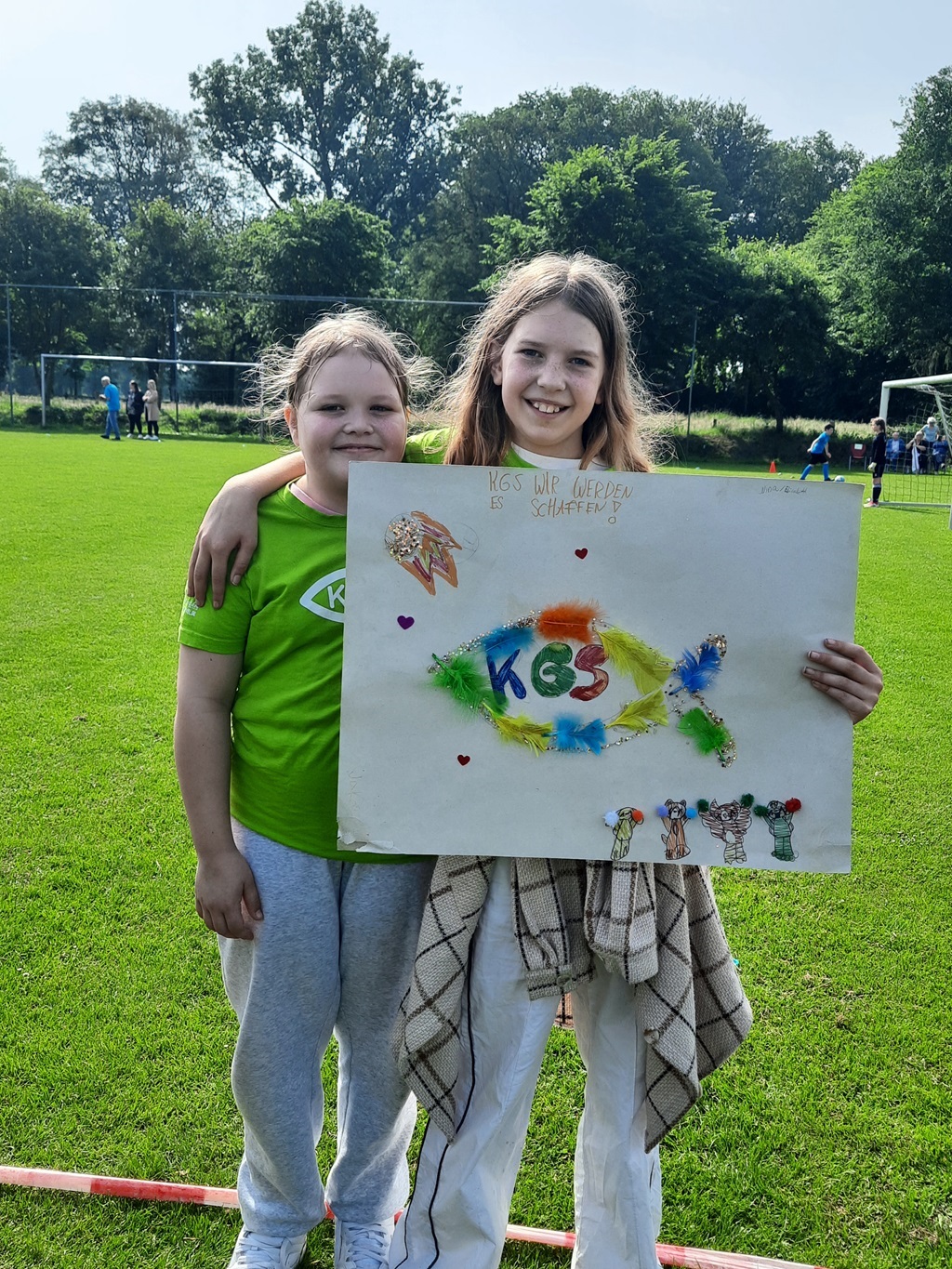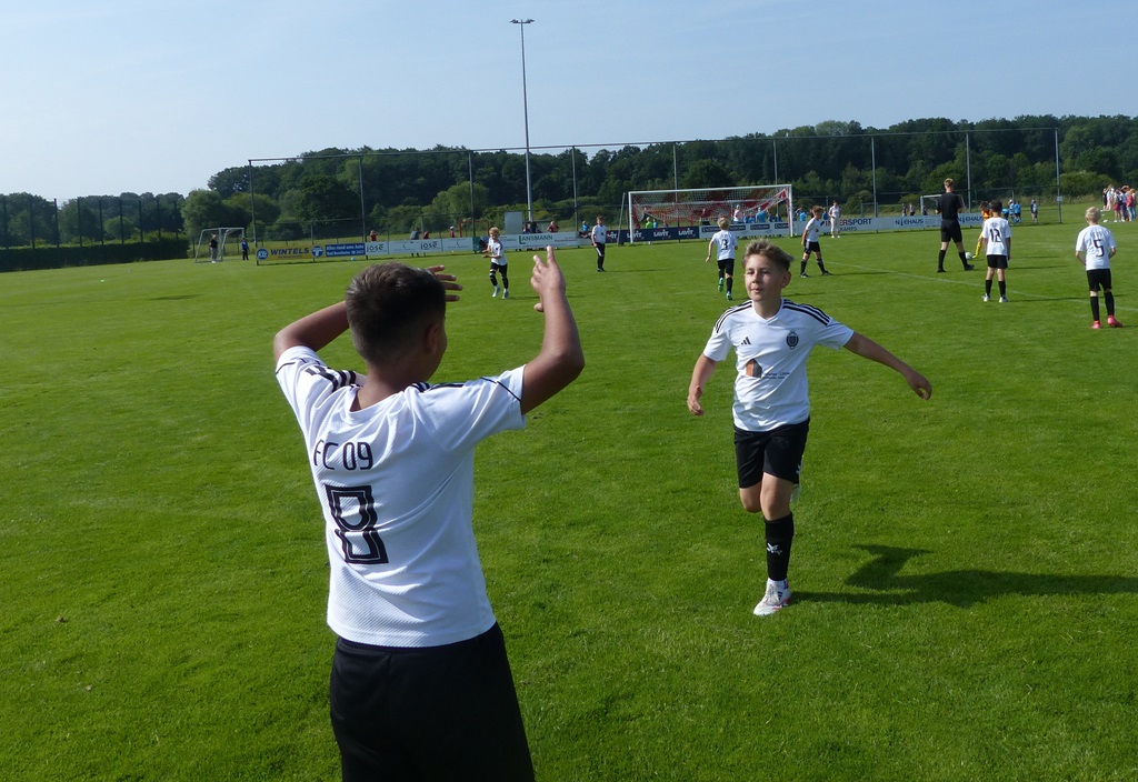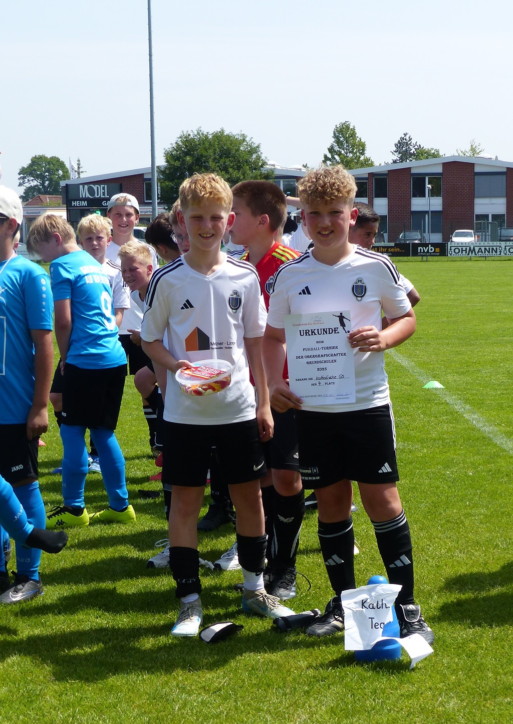 Am 13.06.25 nahm unsere katholische Grundschule mit zwei Jungen- und einer Mädchenmannschaft am Fußballturnier der Obergrafschafter Grundschulen teil. Alle vierten Klassen waren mit vor Ort, unterstützt von einigen Spielerinnen und Spielern aus den dritten Klassen – eine starke Schulvertretung! Die Mädchenmannschaft erreichte einen großartigen 3. Platz, erzielte 7 Tore und ließ nur ein Gegentor im Halbfinale zu. Auch die Jungenmannschaften zeigten vollen Einsatz: Team 1 belegte Platz 4, Team 2 Platz 6 von insgesamt zehn Teams. Bei hochsommerlichen Temperaturen sorgten Wassereimer zur Abkühlung für Spaß und Erfrischung. Besonders hervorzuheben war die großartige Stimmung: Mitschülerinnen und Mitschüler sowie die Teams selbst feuerten sich gegenseitig mit viel Begeisterung an. Ein herzliches Dankeschön gilt Frau Rüggen, die uns engagiert am Spielfeldrand unterstützt hat, sowie allen Eltern und Erziehungsberechtigten, die gekommen sind, um uns anzufeuern! Wir sind stolz auf unsere Kinder – ihr habt unsere Schule mit Teamgeist, Fairness und Freude am Sport hervorragend vertreten!