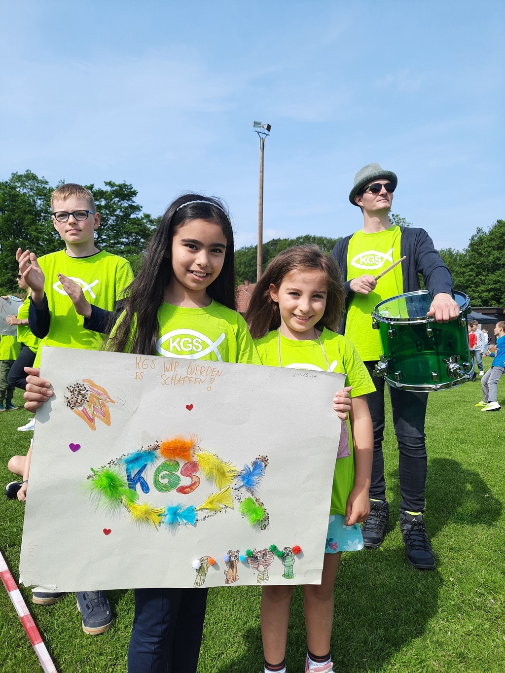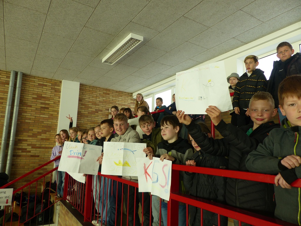 Die anderen Kinder und Lehrer der KGS feuerten die Spielerinnen und Spieler mit Trommeln, selbstgebauten Rasseln, Plakaten, einem riesigen Banner, welches Kinder der KGS in der OGS gestaltet hatten, und vielen verschiedenen Gesängen an.