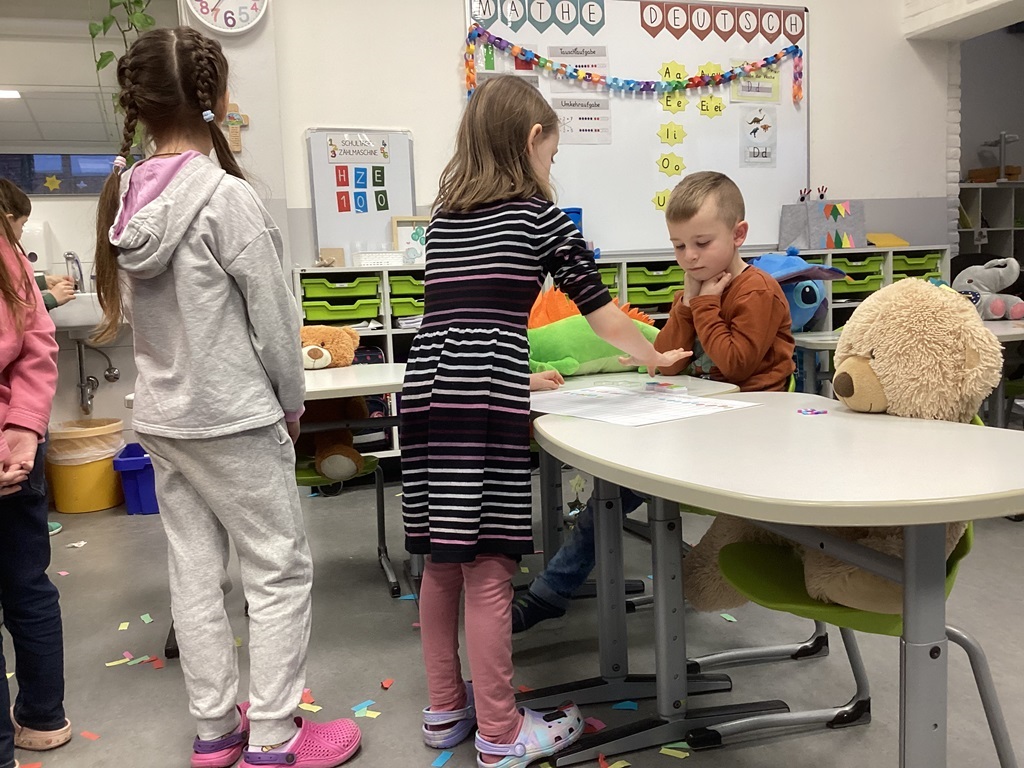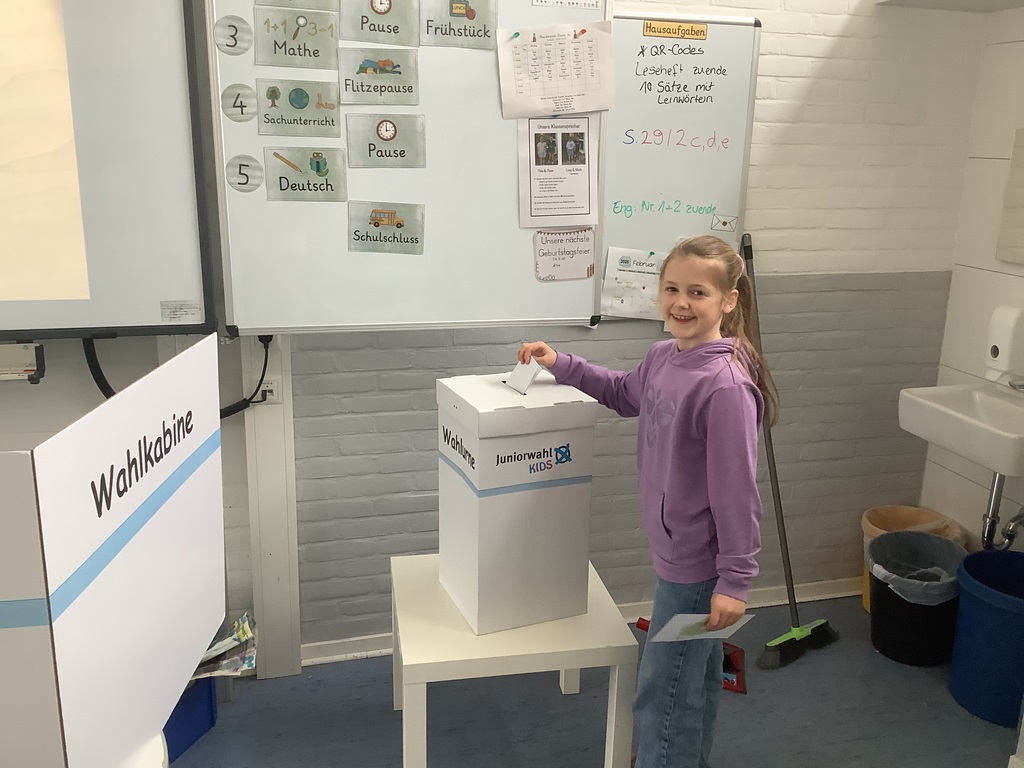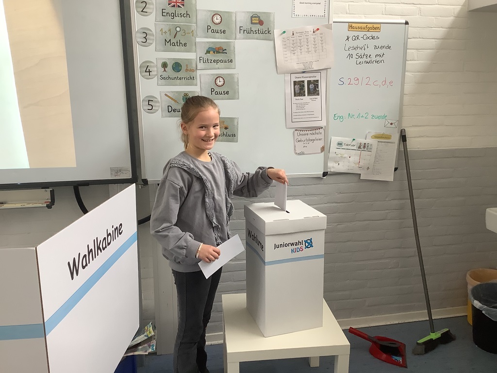 In Deutschland stand am 23.02. die Bundes-tagswahl an. Anlässlich dieses Ereignisses beschäftigten sich die dritten und vierten Klassen eine Woche lang im Rahmen des fächerübergreifenden Projektes „Junior Wahl KIDS“ mit den Themen Wahlen und Demokratie. Zunächst einmal wurde besprochen, was eigentlich eine Demokratie ist und warum sie für uns so wichtig ist. In einem zweiten Schritt durften die Schülerinnen und Schüler eigene Schülerparteien mit eigenen Parteiprogrammen gründen. So standen dann beispielsweise die TSG (Team Schulgarten), die FMP (Für mehr Pause) und die KFG (Klima-freundliche Gemeinschaft) auf dem Wahlzettel der Klasse 4a. In einem letzten Schritt durfte dann jede Klasse für sich wählen – wie auch bei der richtigen Wahl mit Wahlbenachrichtigung, Wahlkabine und Wahlurne. Während die Siegerparteien sich über ihren Sieg freuten, mussten die anderen Parteien lernen, ihre Niederlage wegzustecken – das ist Demokratie! Parallel wurden im Deutschunterricht in Form eines Leseheftes wichtige Informationen zur Bundestagswahl besprochen: die Kandidaten, der Ablauf und auch die Besonderheit dieser Wahl.