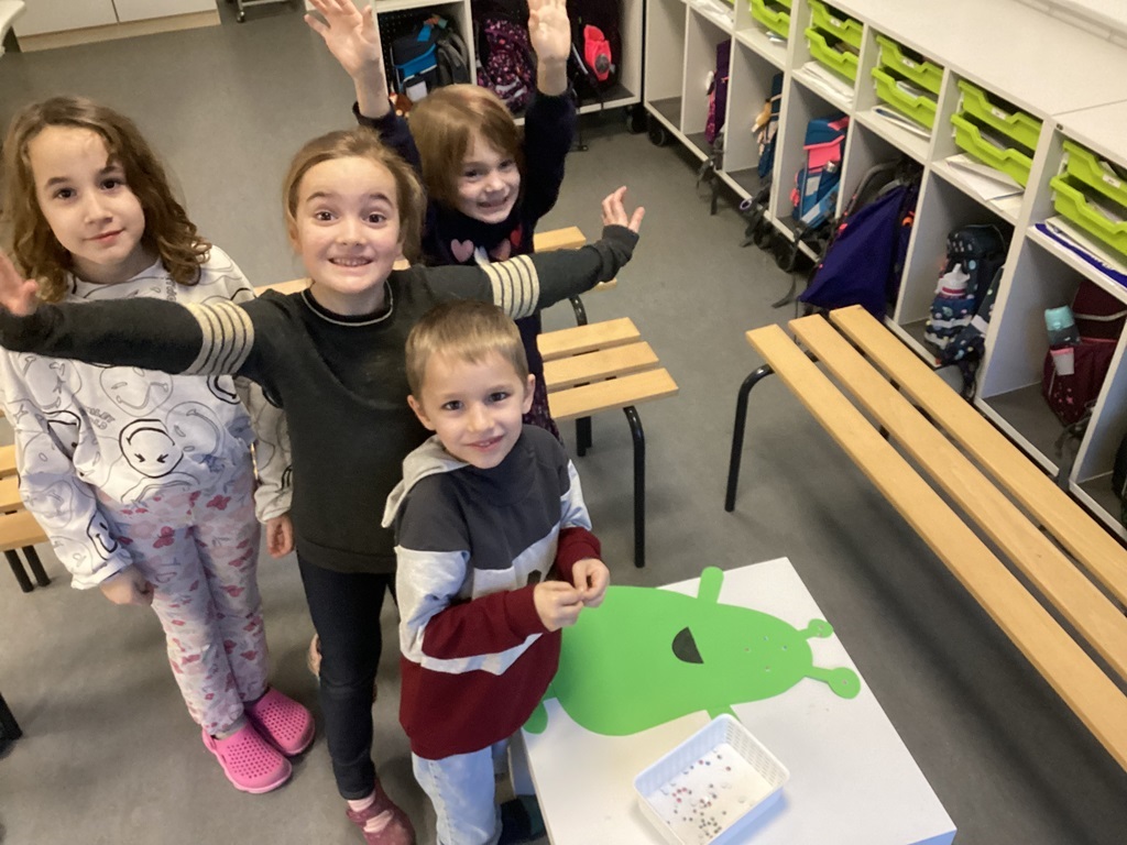 Am 30. Januar 2025 haben die Klassen 1a und 1b den 100. Schultag in der ersten Klasse gefeiert. 100 - das ist eine ganz schön große Zahl! Gemeinsam wurden 100 Rechenaufgaben gelöst, 100 Wörter und Buchstaben geschrieben, 100 Fingerabdrücke verewigt und 100 Wackelaugen auf ein Monster geklebt. Danach wurde ordentlich gefeiert. Zum Frühstück gab es leckeren Kuchen.