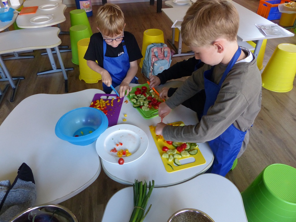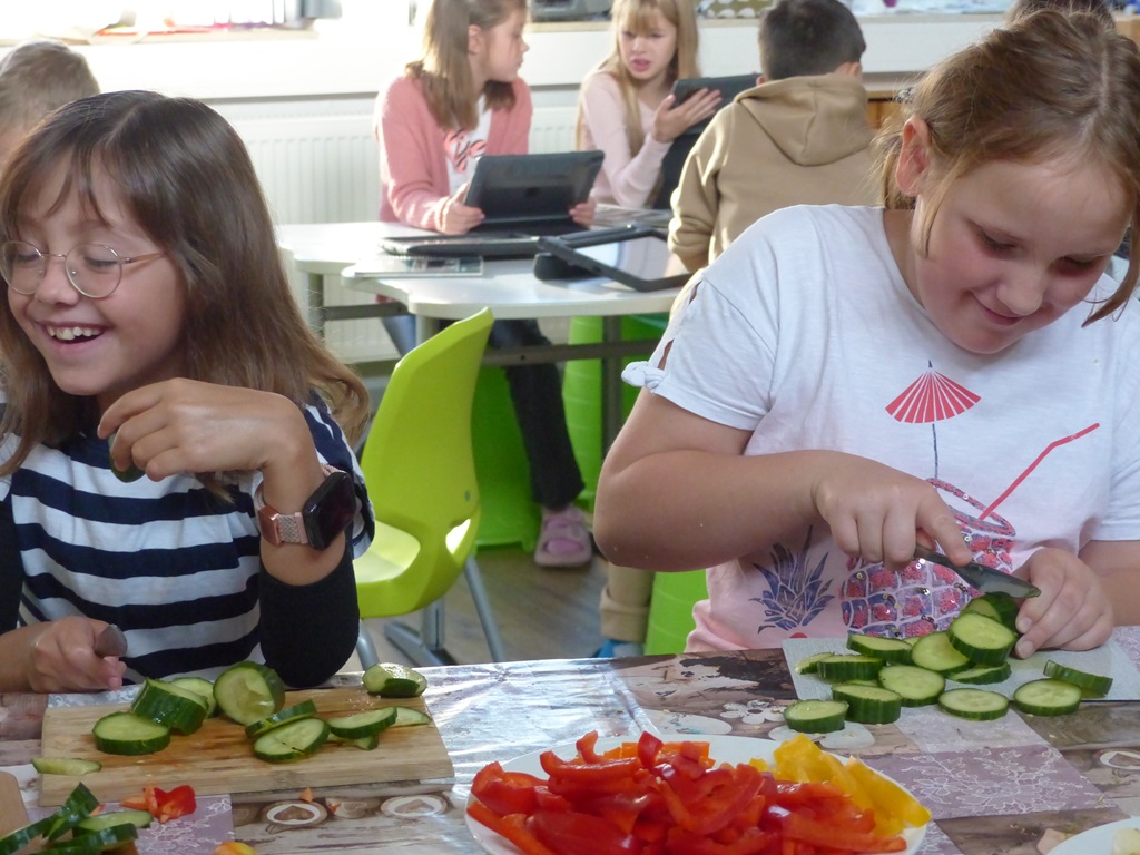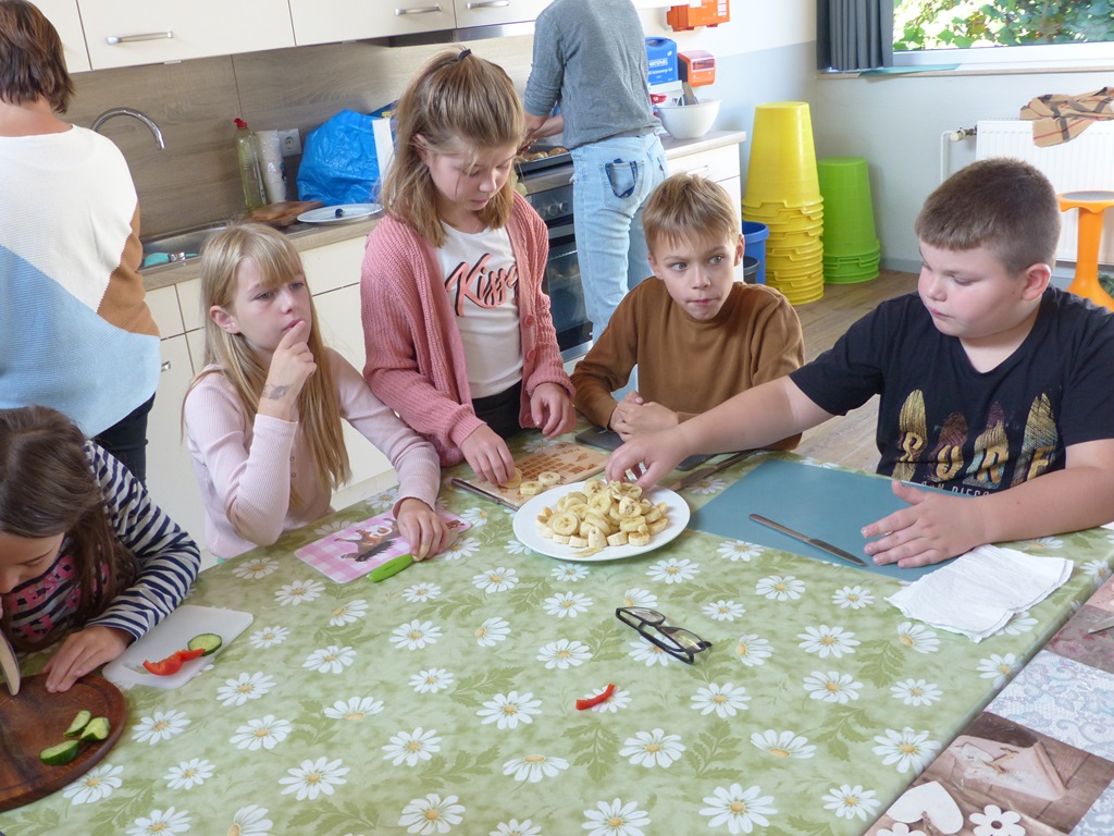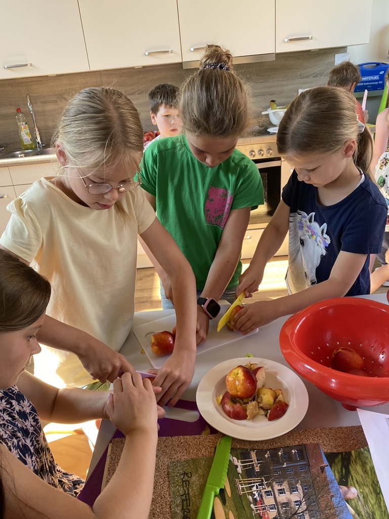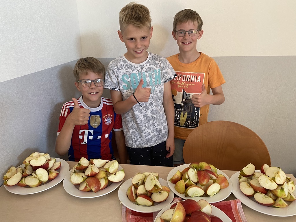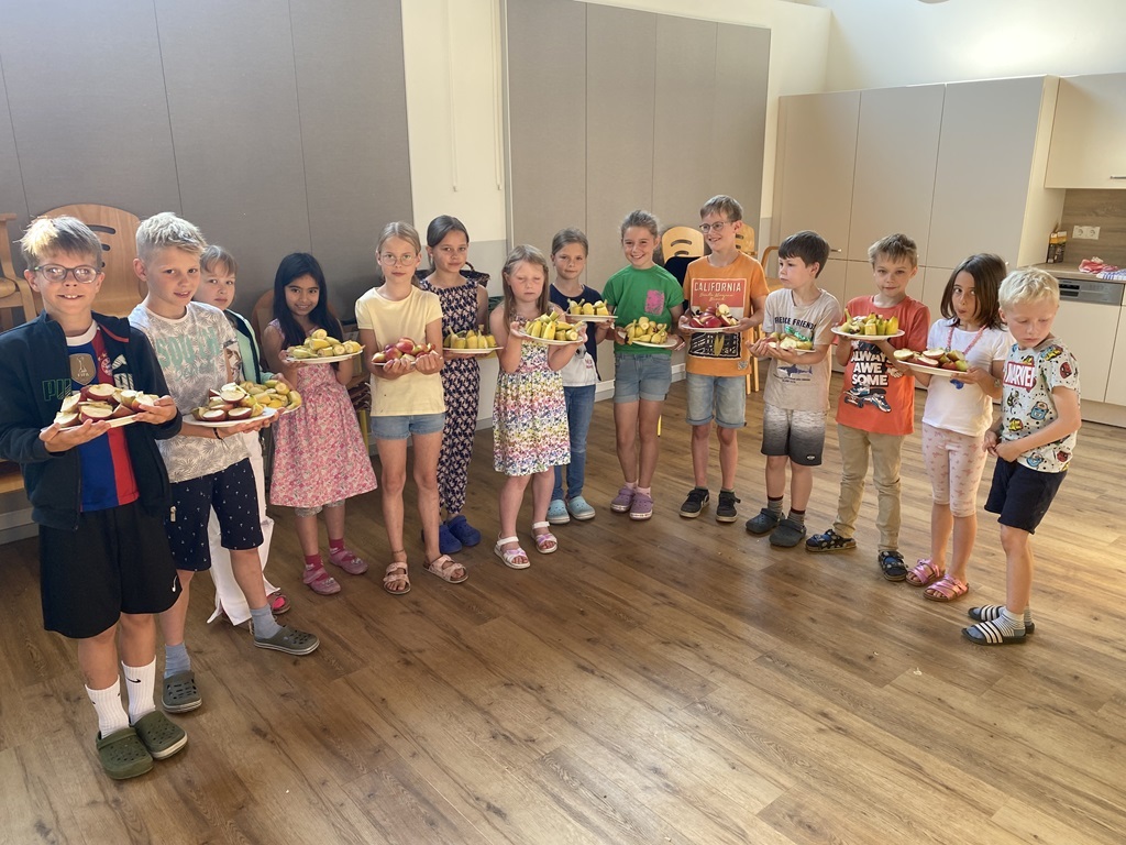Freitags schneiden einige Kinder mit unserer Schulsozialarbeiterin Johanna Glückhardt Obst für die gesamte Schule. Zur ersten großen Pause wird das Obst dann in die Klassen gebracht und kann gegessen werden. Ein absolutes Highlight zum Start ins Wochenende.
