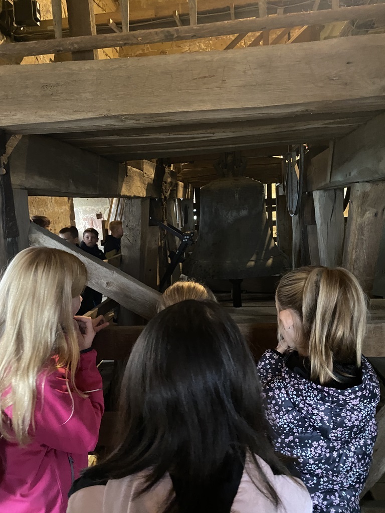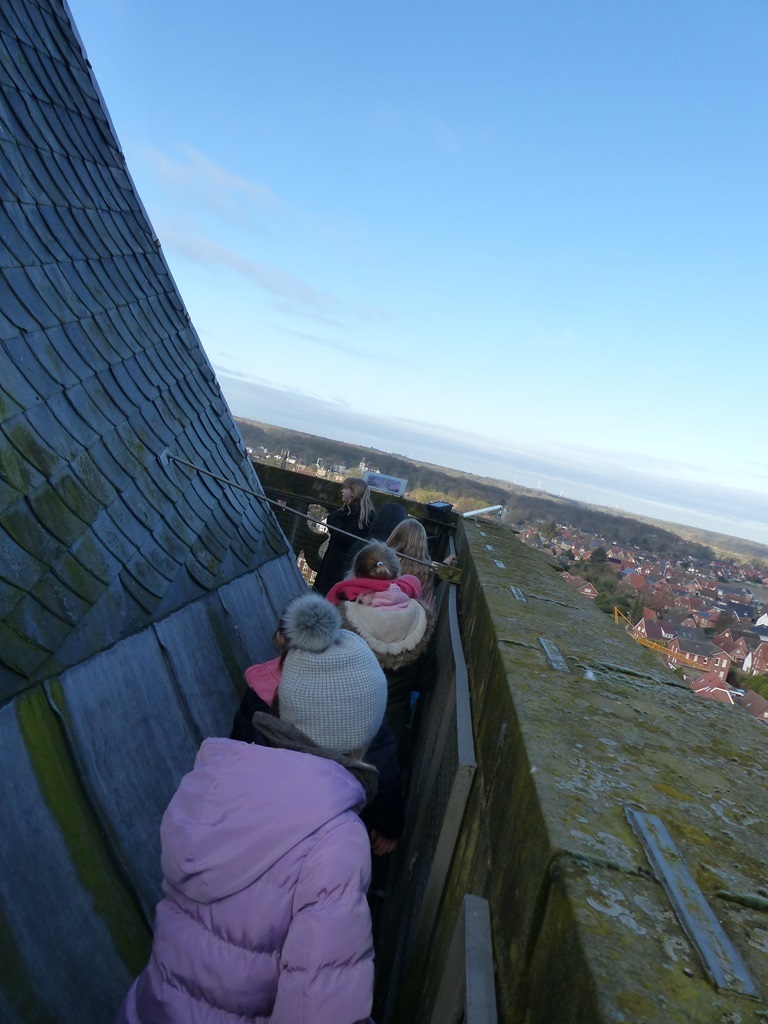 Danach gingen wir zum Schüttorfer Riesen, der ev.-ref. Kirche. Wir erkundeten den Innenraum und besprachen dort die Himmelsrichtungen. Anschließend ging es eine Wendeltreppe hinauf über das Gewölbe. Hier sahen wir alte Sitzbänke. Dann ging es weiter über sehr steile Treppen hinauf. Vorbei am Uhrenwerk und den großen Glocken bis zur Spitze. Hier durften wir außen um den Turm herumlaufen und hatten eine tolle Aussicht.