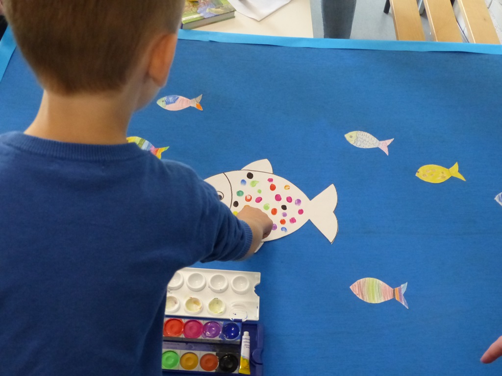 Die Klassen 1a, 1b und 2a haben in ihren Klassen jeweils ein Kunstwerk zum Thema "Tiefe" für den Kinder- und Jugendkunstpreis hergestellt und eingereicht. Dabei entwarfen sie gemeinsam als Klasse eine geheimnisvolle Höhle in einem Vulkan, einen Wunschbrunnen mit ihren tiefsten Wünschen und sie schickten ihr Klassentier Kalle auf eine spannende Reise in die noch unbekannte Tiefsee. Die Kinder hatten große Freude gemeinsam eine Idee zu entwickeln und diese in Teamarbeit umzusetzen.