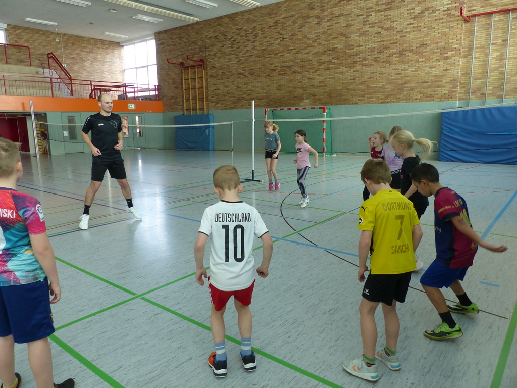 Am 04.04.2025 fand für unsere vierten Klassen der Handballaktionstag mit der HSG Nordhorn-Lingen statt. An verschiedenen Stationen konnten die Viertklässlerinnen und Viertklässler ihr handballerisches Geschick unter Beweis stellen. Am Ende erhielten alle Kinder den „Tiga-Pass“ und konnten sich noch ein Autogramm von Mika Sajenev, Kreisspieler bei der HSG Nordhorn-Lingen, holen. Die Begeisterung war bei allen Kindern groß und der ein oder andere hat sich sicherlich vom „Handballfieber“ anstecken lassen.