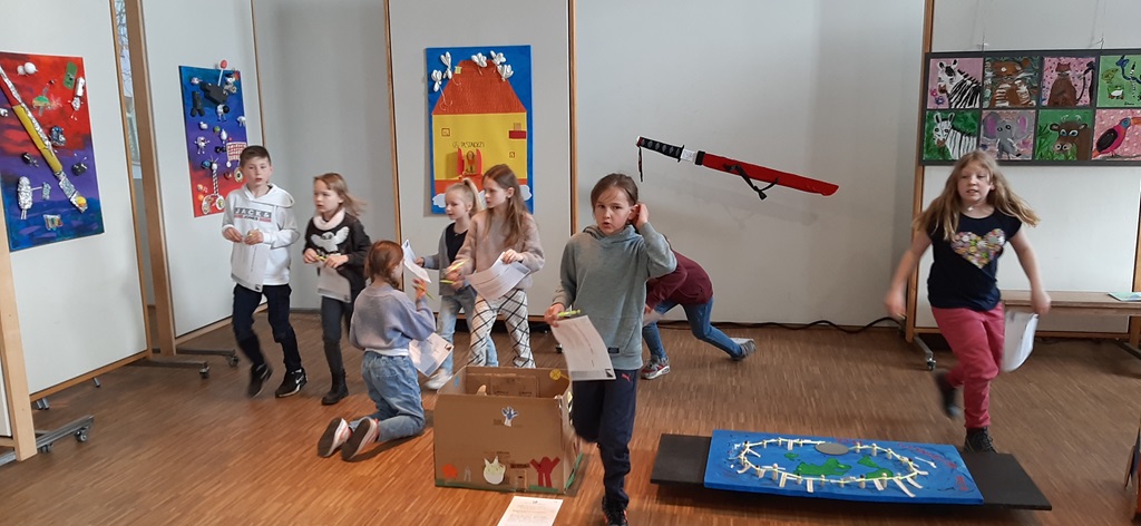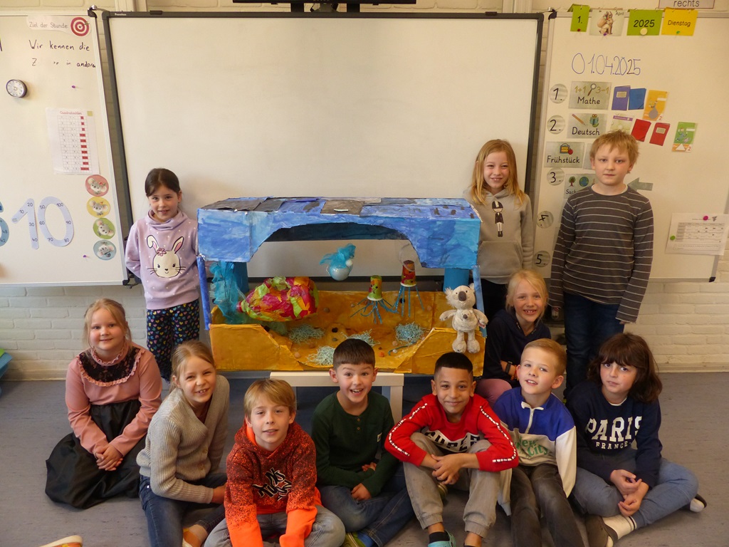 Die Klassen 1a, 1b und 2a haben in ihren Klassen jeweils ein Kunstwerk zum Thema "Tiefe" für den Kinder- und Jugendkunstpreis hergestellt und eingereicht. Dabei entwarfen sie gemeinsam als Klasse eine geheimnisvolle Höhle in einem Vulkan, einen Wunschbrunnen mit ihren tiefsten Wünschen und sie schickten ihr Klassentier Kalle auf eine spannende Reise in die noch unbekannte Tiefsee. Die Kinder hatten große Freude gemeinsam eine Idee zu entwickeln und diese in Teamarbeit umzusetzen.