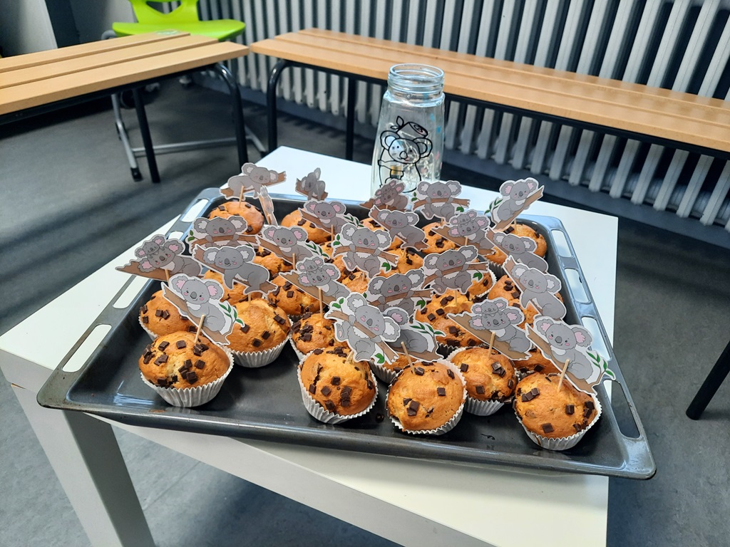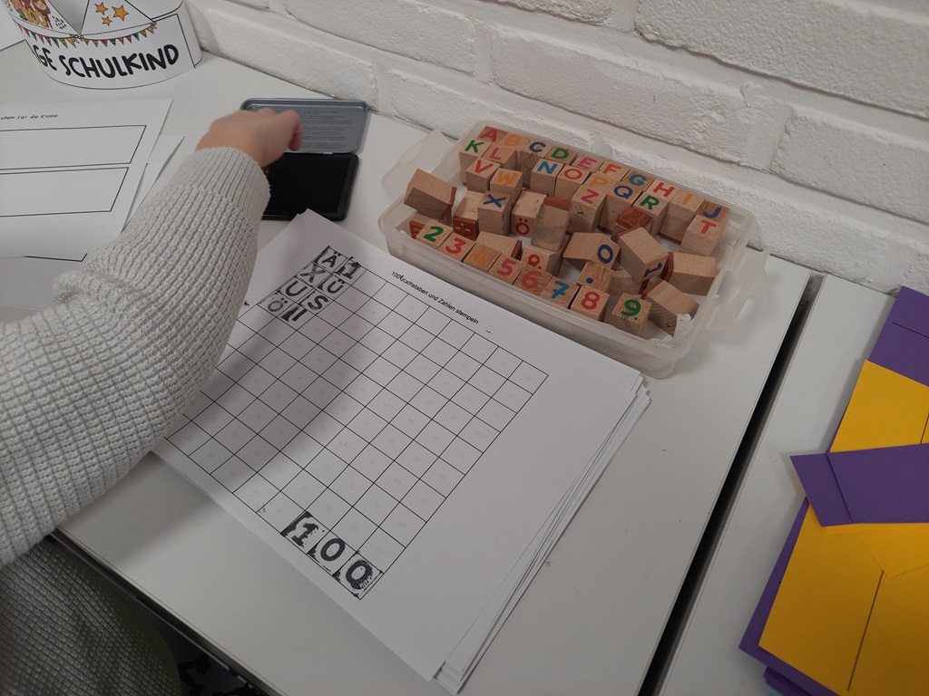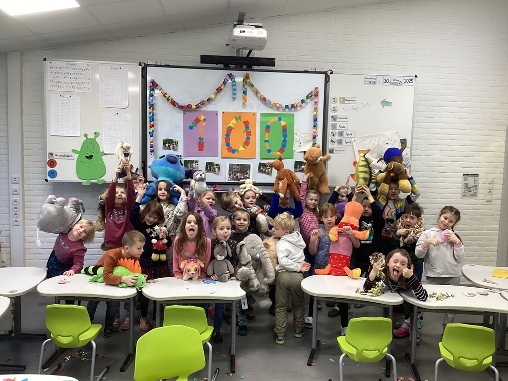 Grund genug, um Koala-Muffins zu naschen, Kronen zu basteln und Urkunden zu erhalten. Vor allem aber stand die Zahl 100 im Fokus. So wurden Girlanden aus 100 Papierschlaufen und Ketten aus 100 Büroklammern gebastelt sowie ein Monster mit genau 100 Augen verziert. Außerdem wurde 100 mal gestempelt, mit 100 Puzzleteilen gepuzzelt, es wurden 100 Matheaufgaben gerechnet und 100 Wörter geschrieben.