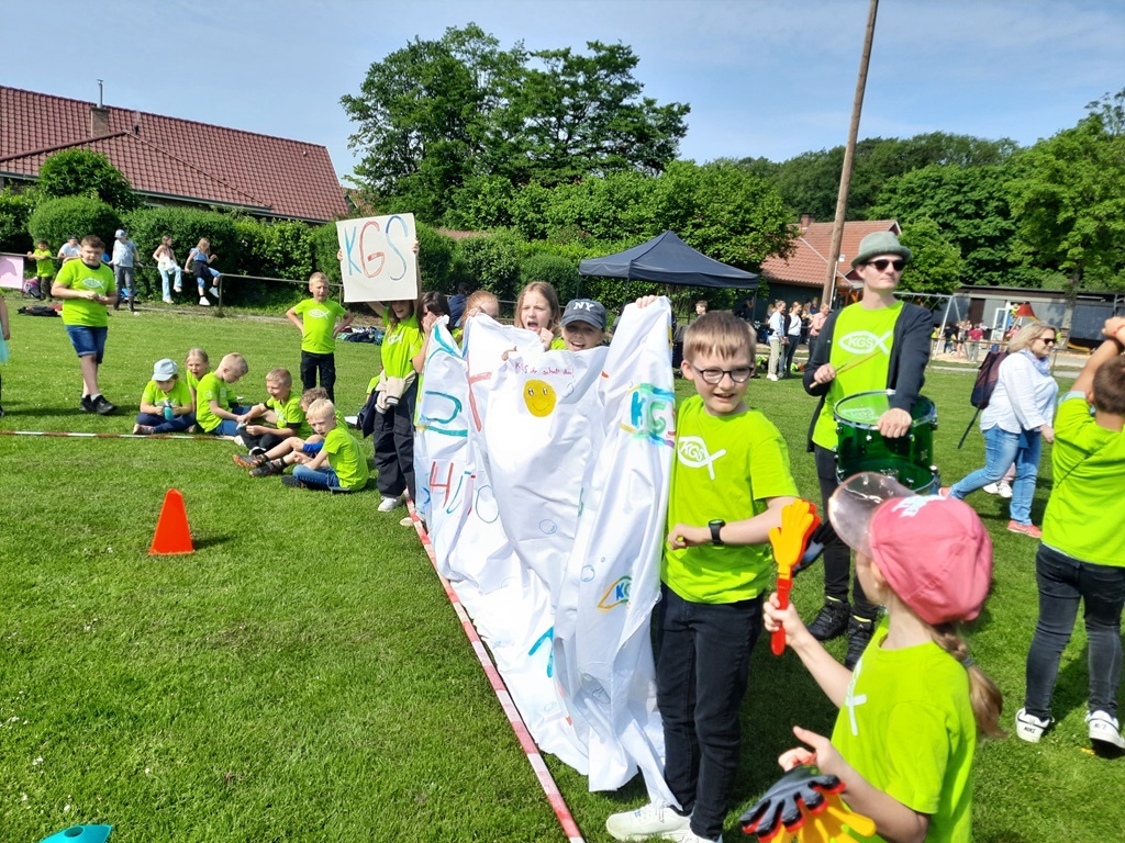 Die anderen Kinder und Lehrer der KGS feuerten die Spielerinnen und Spieler mit Trommeln, selbstgebauten Rasseln, Plakaten, einem riesigen Banner, welches Kinder der KGS in der OGS gestaltet hatten, und vielen verschiedenen Gesängen an.