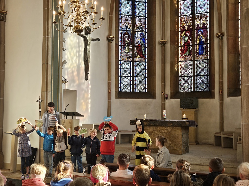 In gemeinsam gesungenen Liedern und Tänzen sowie Gebeten und kleinen Spielszenen zeigten die Kinder, warum Bienen so wichtig für uns alle sind. Sie bestäuben Blumen, Obstbäume und viele Pflanzen, damit wir später Früchte, Gemüse und leckeren Honig genießen können.