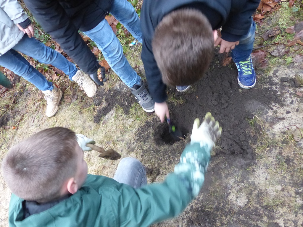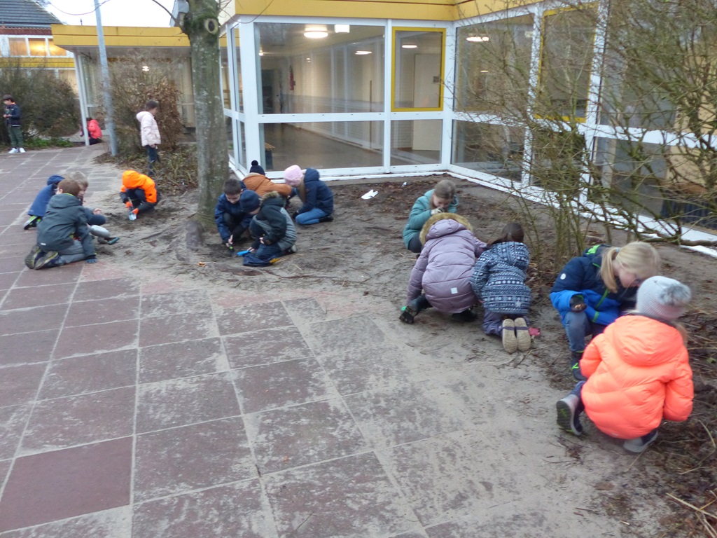 Am 31. Januar machten sich die Erstklässler gemeinsam mit ihren Klassenpaten aus Klasse 3 an das Pflanzen zahlreicher Blumenzwiebeln. Nun hoffen wir, dass unser Schulhof bald durch viele bunte Blumen verschönert wird.
