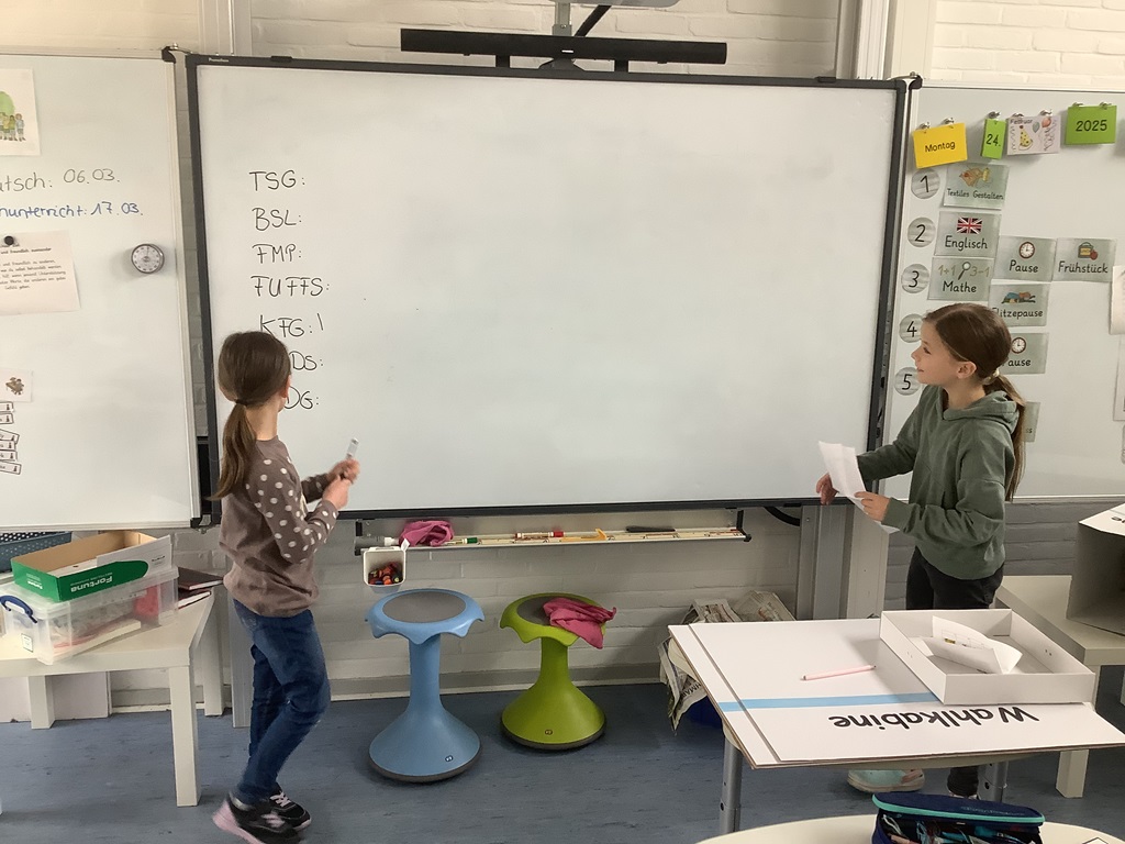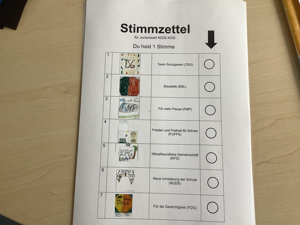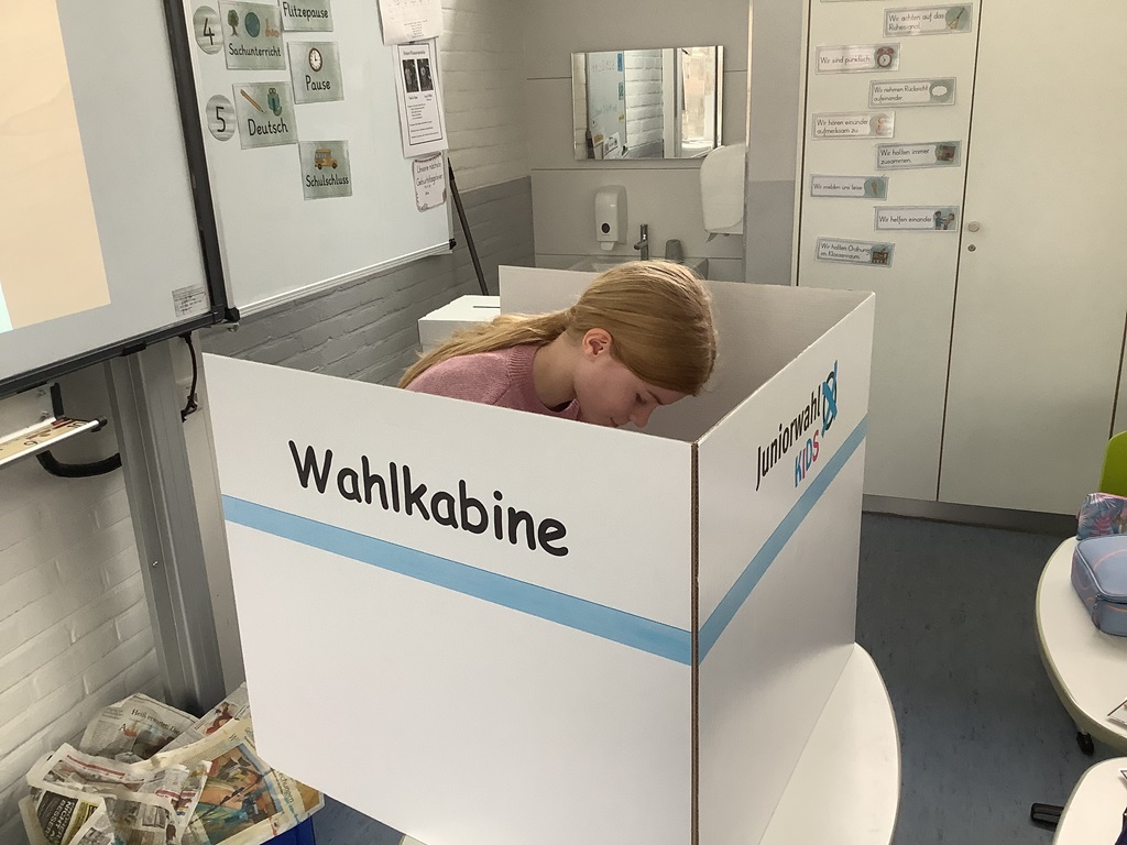In Deutschland stand am 23.02. die Bundes-tagswahl an. Anlässlich dieses Ereignisses beschäftigten sich die dritten und vierten Klassen eine Woche lang im Rahmen des fächerübergreifenden Projektes „Junior Wahl KIDS“ mit den Themen Wahlen und Demokratie. Zunächst einmal wurde besprochen, was eigentlich eine Demokratie ist und warum sie für uns so wichtig ist. In einem zweiten Schritt durften die Schülerinnen und Schüler eigene Schülerparteien mit eigenen Parteiprogrammen gründen. So standen dann beispielsweise die TSG (Team Schulgarten), die FMP (Für mehr Pause) und die KFG (Klima-freundliche Gemeinschaft) auf dem Wahlzettel der Klasse 4a. In einem letzten Schritt durfte dann jede Klasse für sich wählen – wie auch bei der richtigen Wahl mit Wahlbenachrichtigung, Wahlkabine und Wahlurne. Während die Siegerparteien sich über ihren Sieg freuten, mussten die anderen Parteien lernen, ihre Niederlage wegzustecken – das ist Demokratie! Parallel wurden im Deutschunterricht in Form eines Leseheftes wichtige Informationen zur Bundestagswahl besprochen: die Kandidaten, der Ablauf und auch die Besonderheit dieser Wahl.
