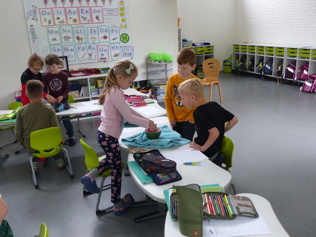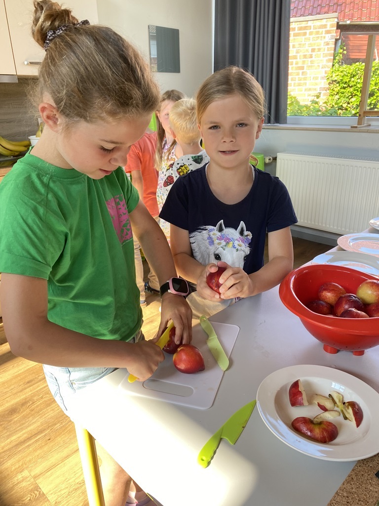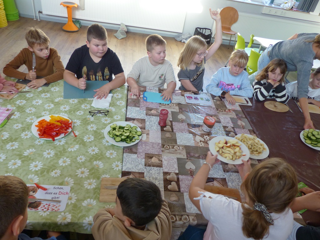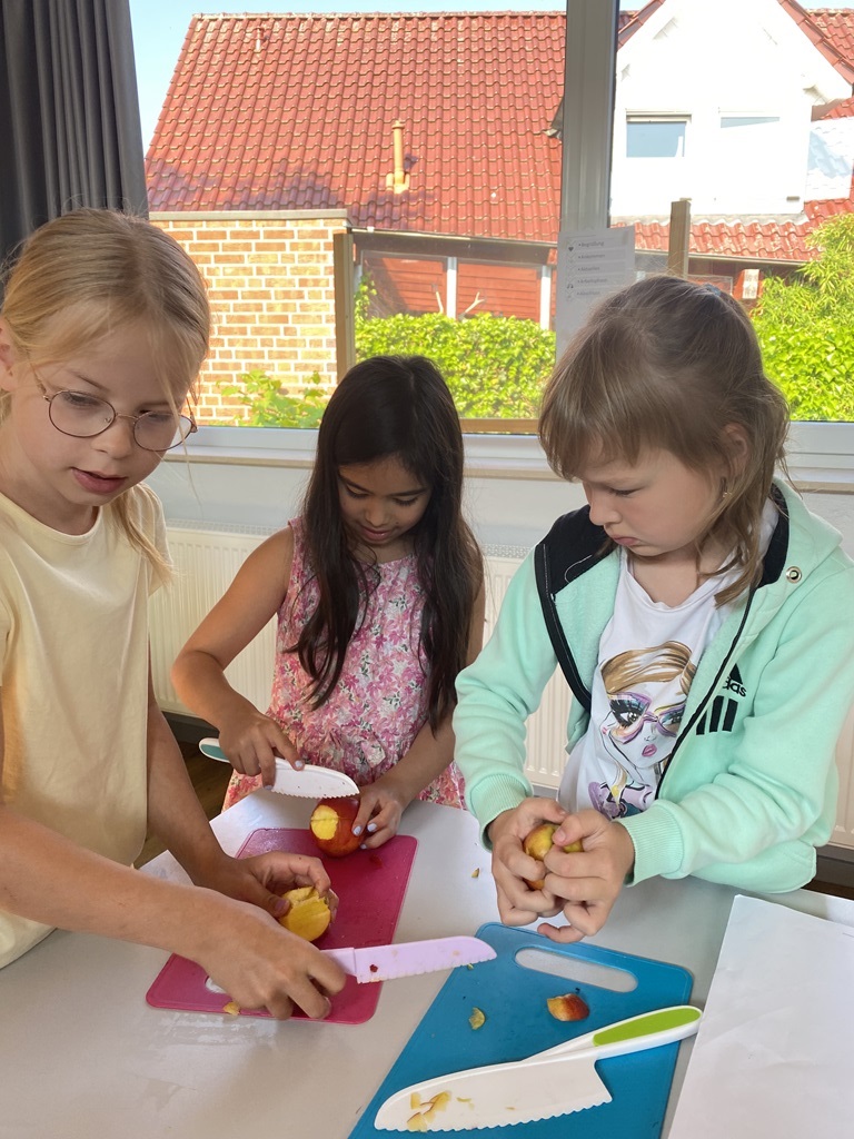 Freitags schneiden einige Kinder mit unserer Schulsozialarbeiterin Johanna Glückhardt Obst für die gesamte Schule. Zur ersten großen Pause wird das Obst dann in die Klassen gebracht und kann gegessen werden. Ein absolutes Highlight zum Start ins Wochenende.