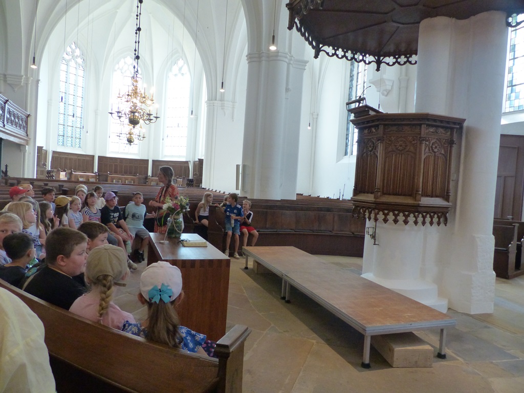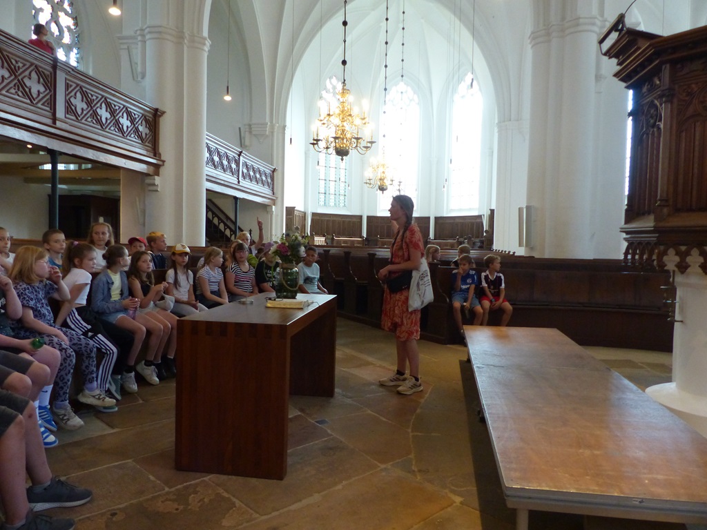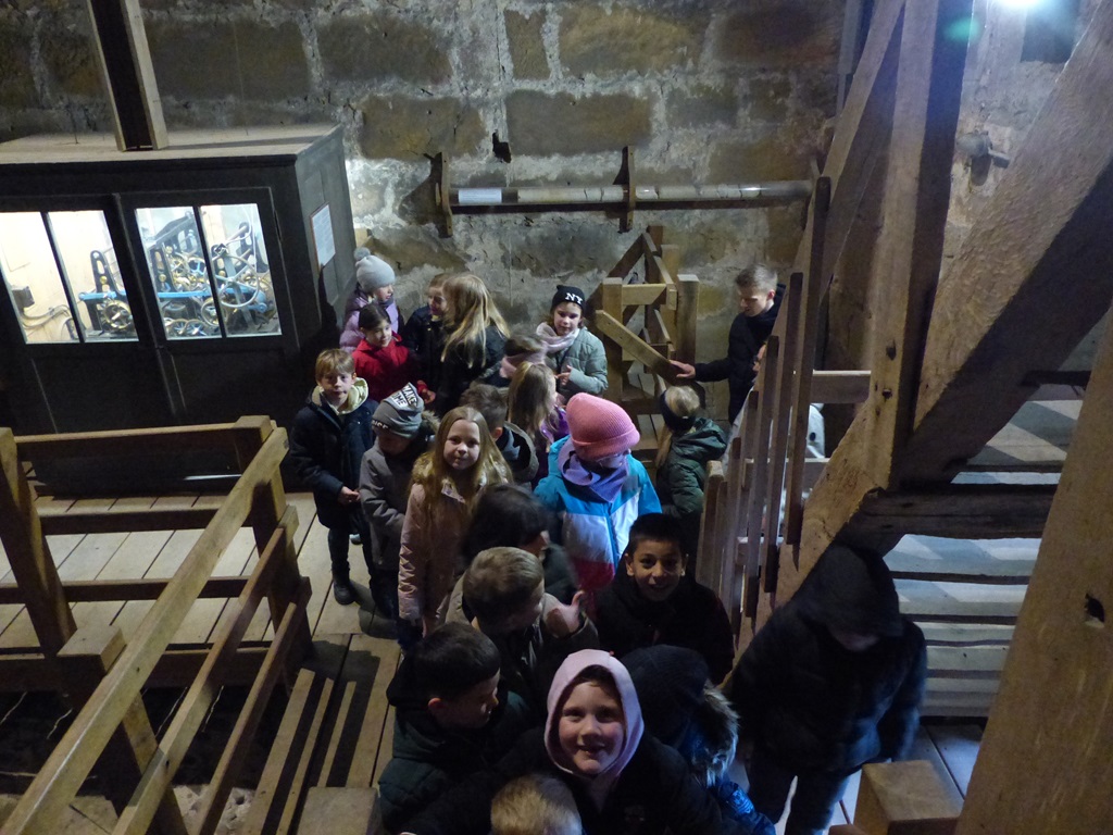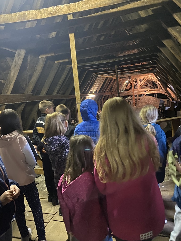 Danach gingen wir zum Schüttorfer Riesen, der ev.-ref. Kirche. Wir erkundeten den Innenraum und besprachen dort die Himmelsrichtungen. Anschließend ging es eine Wendeltreppe hinauf über das Gewölbe. Hier sahen wir alte Sitzbänke. Dann ging es weiter über sehr steile Treppen hinauf. Vorbei am Uhrenwerk und den großen Glocken bis zur Spitze. Hier durften wir außen um den Turm herumlaufen und hatten eine tolle Aussicht.