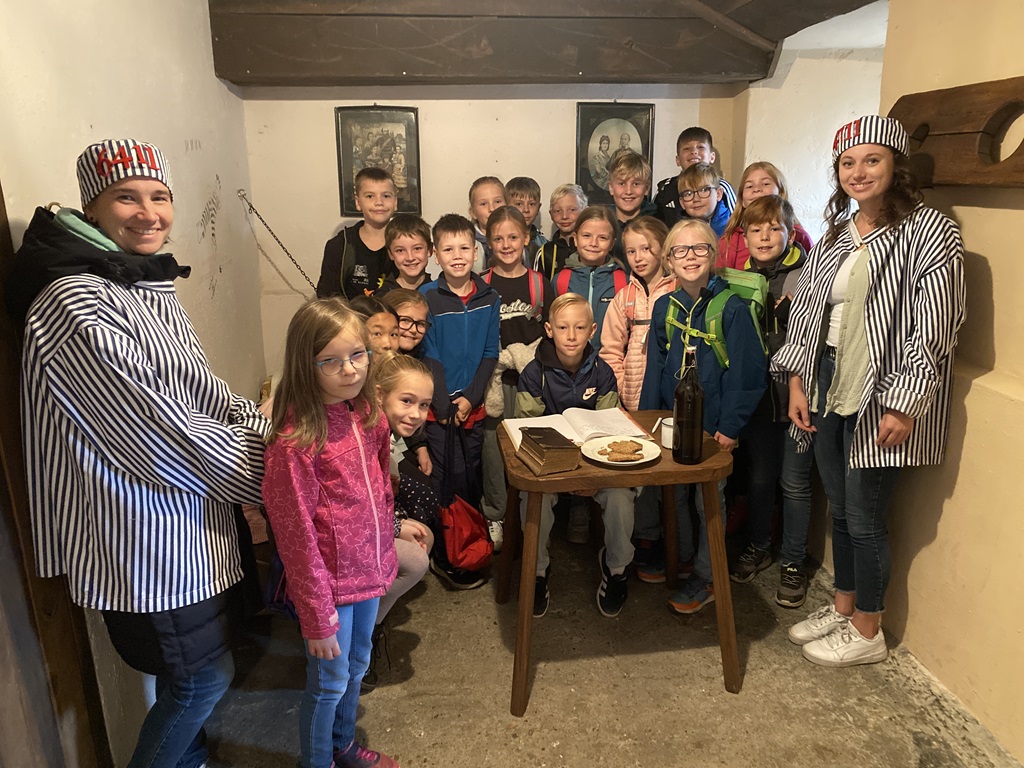 Sie besichtigten den Schüttorfer Riesen. Die Klasse 4b war auch im alten Rathaus im Sitzungssaal und im Gefängnis.