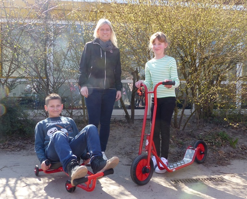 Nach vielen Jahren der intensiven Nutzung wurde ein Teil der alten Fahrzeuge gegen zwei neue Roller sowie vier neue Racer ausgetauscht. Offiziell übergeben wurden diese von Claudia Hermeling vom Förderverein.