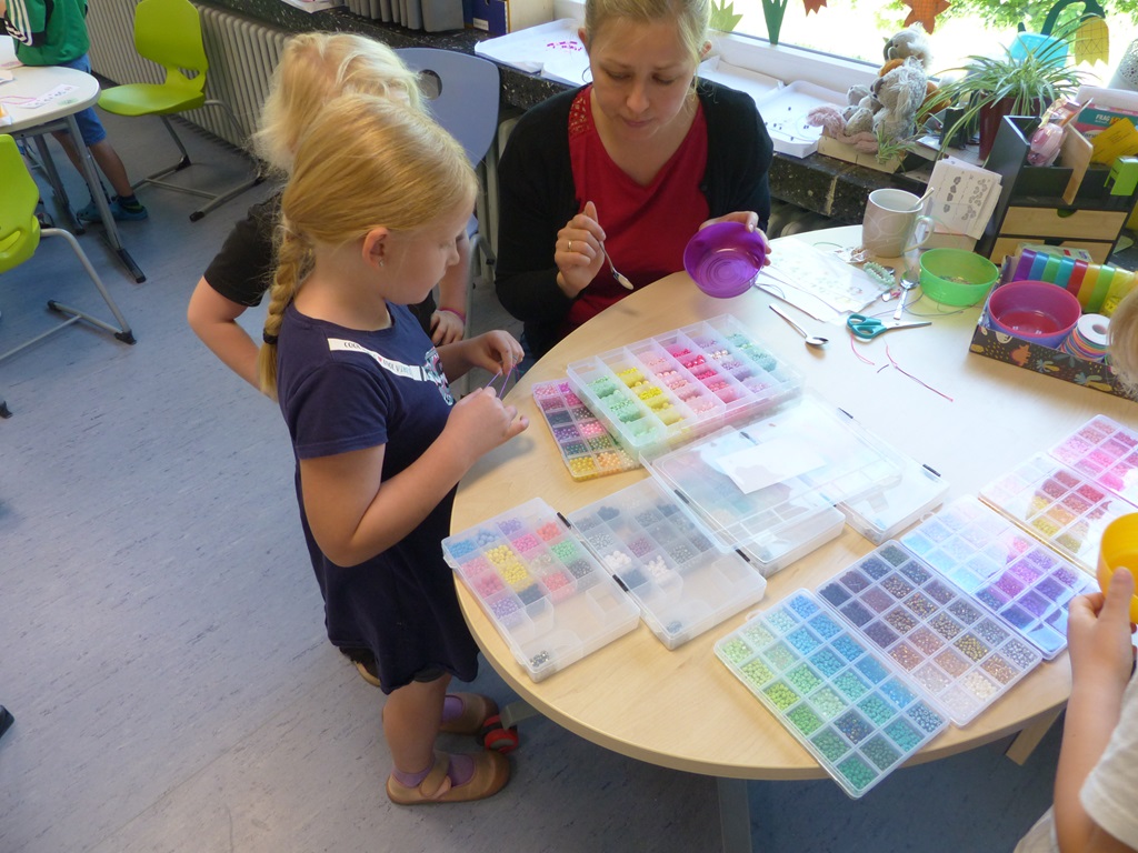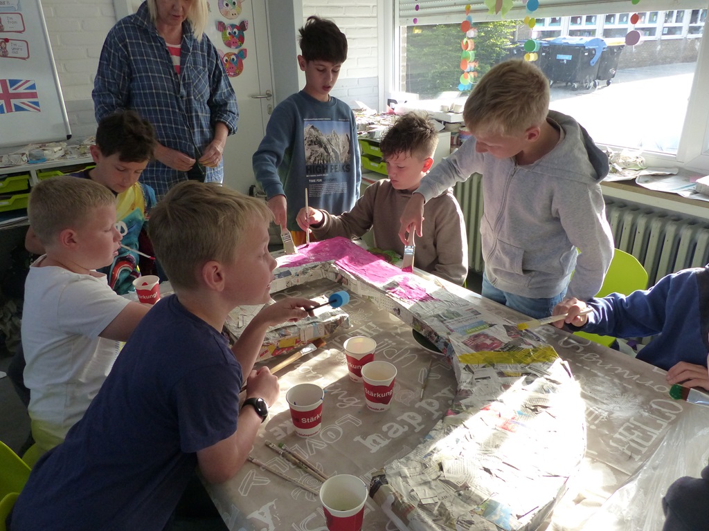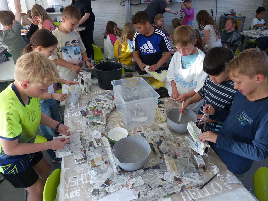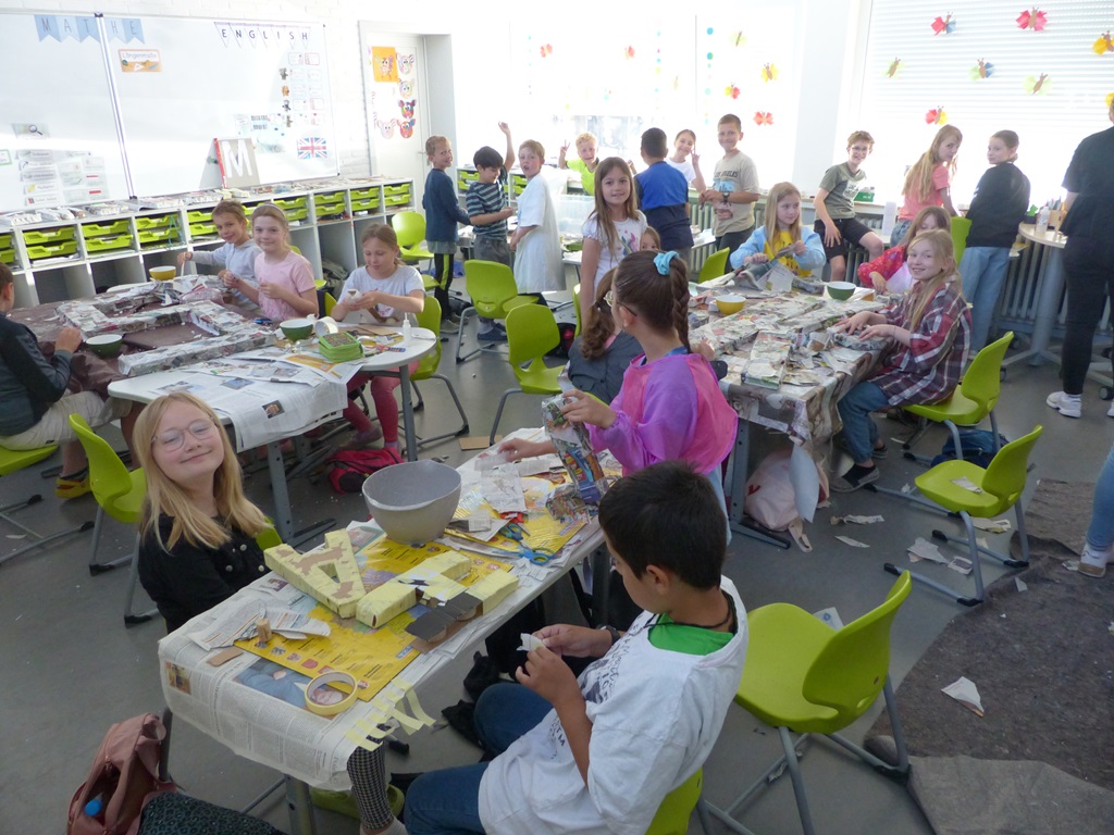Eine ganze Woche lang konnten alle Hefte, Mappen und Bücher zu Hause gelassen werden. Stattdessen wurden Gerichte aus verschiedenen Nationen gekocht und gebacken, bunte Perlen-Armbänder gebastelt, kunterbunte Tänze und Cup-Songs eingeübt und verschiedene Beats trommelnd auf Eimern produziert. Auch hatten die Kinder die Möglichkeit, Spiele und Gesänge aus anderen Kulturen kennenzulernen oder mithilfe von Pappmaché riesige 3D-Buchstaben herzustellen und darüber hinaus Upcycling-Ideen umzusetzen.