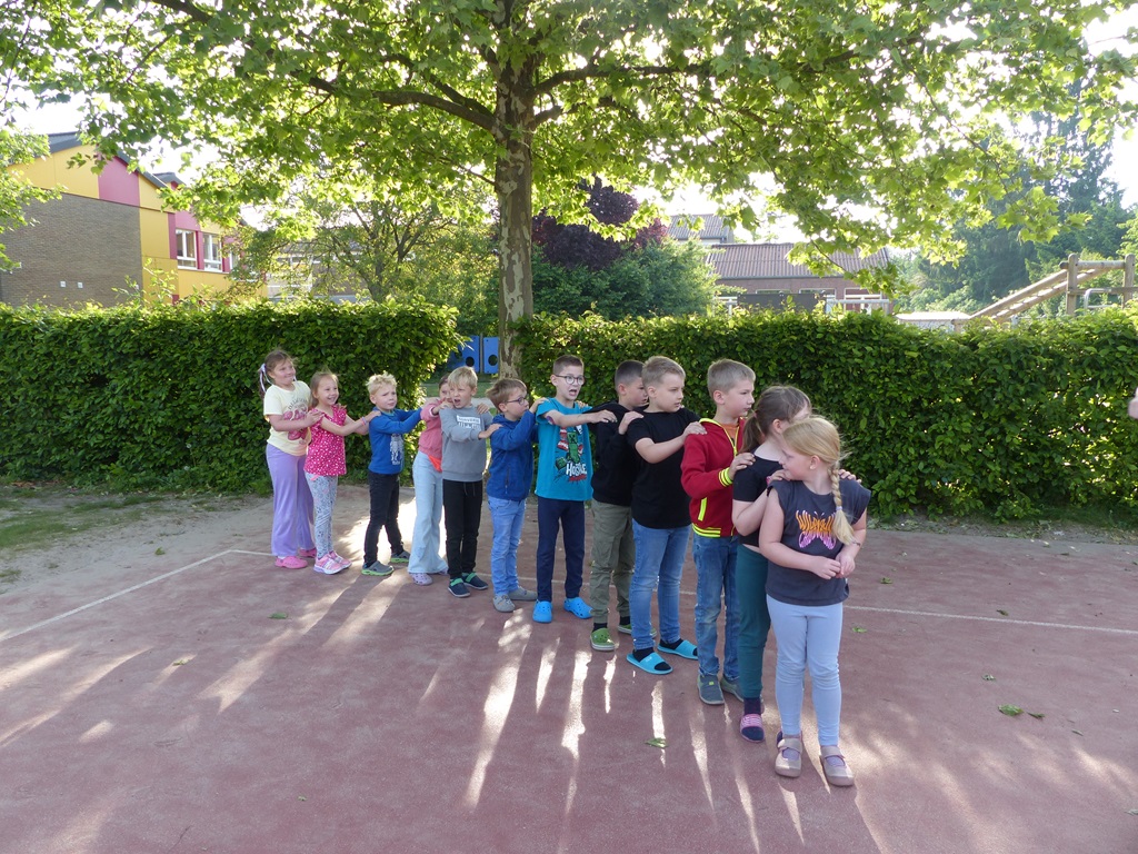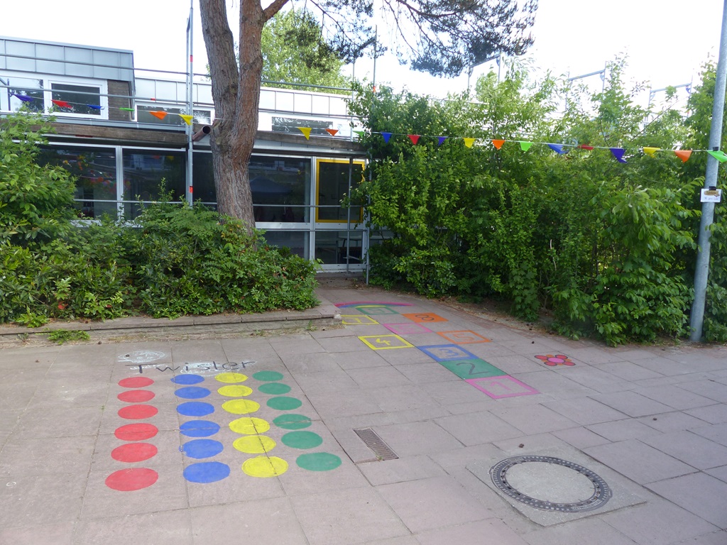 Für mehr Farbe und Spielmöglichkeiten auf unserem Schulhof sorgten im Mai Frau Heintze und Frau Havenga durch die Gestaltung von Hüpfekästchen, Twister und weiteren liebevoll gemalten Blumen und Smileys. Bei den Kindern kamen die neuen Spiele super an.