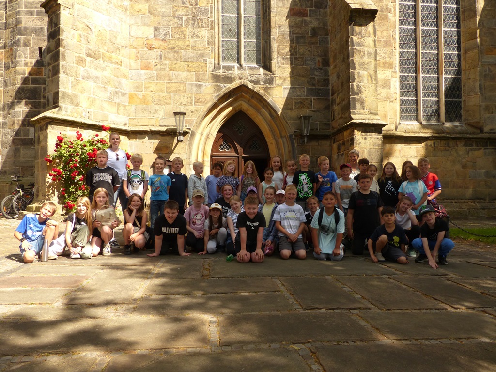 Wir, die Klassen 4a und 4b, waren vom 21.8.2024 bis zum 23.8.2024 auf Klassenfahrt in Tecklenburg. Wir hatten ein Ritterprogramm und haben sehr viele großartige Sachen gemacht. Zum Beispiel durften wir uns verkleiden und ein kleines Theater aufführen. Außerdem haben wir eine Ritter-Rallye in Gruppen in der Stadt gemacht. Auch eine Zimmer-Olympiade gab es. Dort wurde entschieden, welches Zimmer am schönsten war. Das war richtig cool. Das Essen in der Jugendherberge war auch sehr lecker. Einmal gab es sogar ein Rittermahl, da haben wir so gegessen, wie Ritter früher gegessen haben. Zum Abschied gab es noch eine coole Disco. Wir hatten eine sehr abenteuerliche, lustige und schöne Klassenfahrt, an die wir uns gerne erinnern.