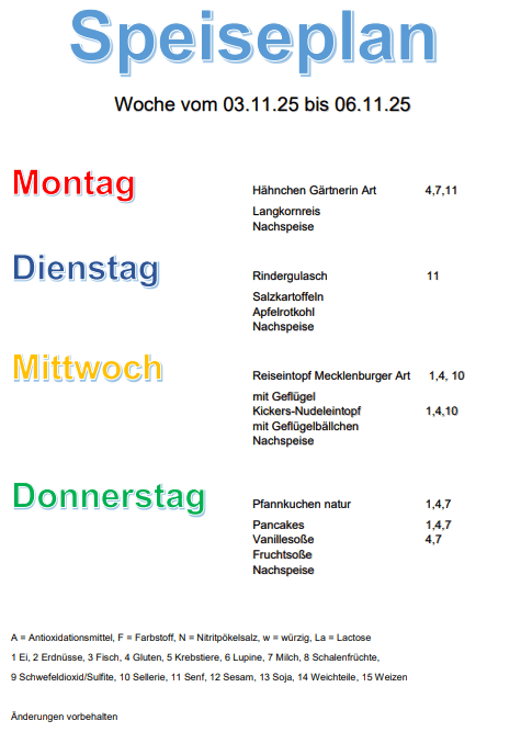 In der Mensa wird den Kindern im Zeitraum von 12.00 Uhr bis 12.30 Uhr und von 12:54 Uhr bis 13:30 Uhr ein Essen von der Firma Apetito zum Preis von 3,50 € serviert. Die Schülerinnen und Schüler können aber auch ihre eigene Verpflegung mitbringen.
