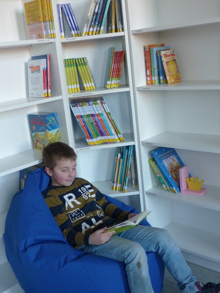 Ein Grundsortiment wurde von der Schule angeschafft, und nun wächst die Bücherei durch Bücher der Kinder, welche sie zu ihrem Geburtstag der Bücherei schenken.